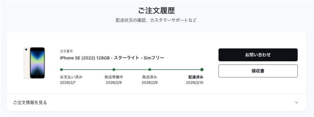 今回はネットで注文してから、わずか3日で自宅に到着しました。急にスマホが故障して代替機が必要になった場合でも、このスピード感なら安心です。
